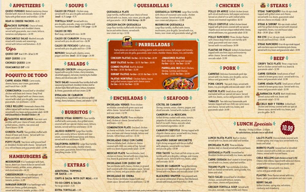 The menu at Los Jimadores offers a wide range of hearty dishes and drinks. Signature fajitas highlight the beef and grilled chicken choices. Traditional favorites like enchiladas and tacos showcase authentic flavors. Breakfast items keep diners fueled all day. Unique dips, such as queso and guacamole, invite sharing among friends. Appetizers lead with tasty nachos and flan for a sweet ending. Both kids and adults enjoy the diverse selections, promising something special for every taste.