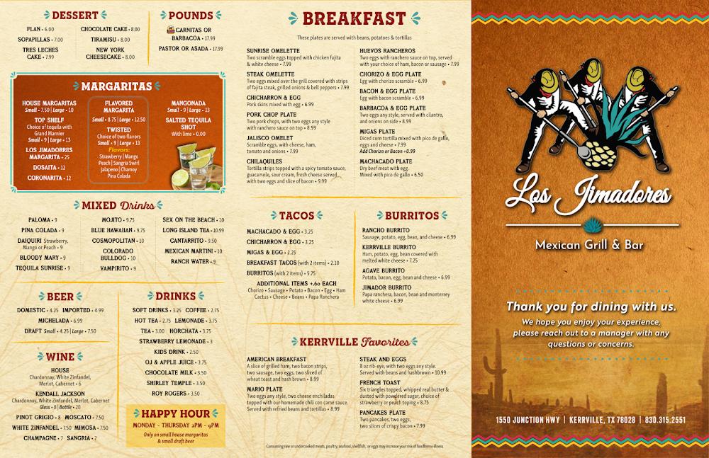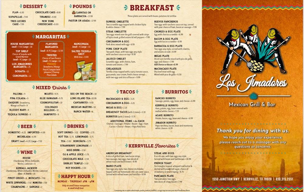 Discover Los Jimadores Mexican Grill & Bar, your premier destination for authentic Mexican cuisine in Kerrville, TX. Savor our expertly crafted dishes, featuring our signature fajitas made from premium 100% Angus beef, prepared fresh daily. Unwind during our fantastic happy hour specials available Monday through Thursday, including irresistible deals on small and large house margaritas. With a fully stocked bar and a variety of local specialties, we cater to all tastes. Enjoy comfortable seating and accessible facilities, making it the perfect spot for breakfast, lunch, or dinner. Visit us today at 1550 Junction Hwy or call +1 830-315-2551 for takeout or delivery!